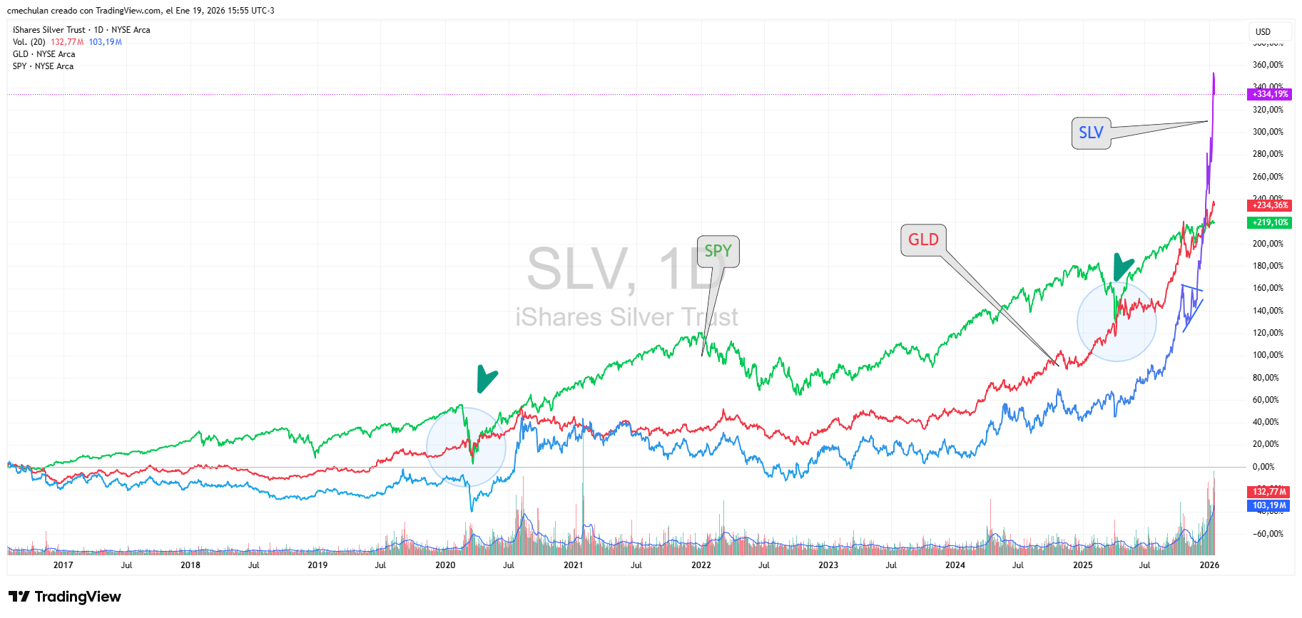 Por su parte, el S&P 500 (vía SPY) vivió un ciclo clásico de post‑pandemia: rally violento en 2020–2021, corrección importante en 2022 y recuperación en 2023–2024, consolidándose en 2025 con subas más moderadas frente al boom de los metales. El balance del período sigue favoreciendo a la renta variable americana en el largo plazo, pero el último tramo revalorizó el rol defensivo y oportunista de GLD y SLV dentro del portafolio.