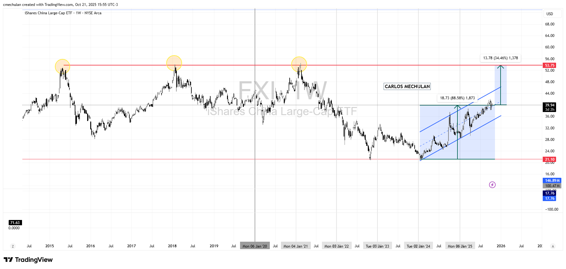 FXI demostró en estos años que la zona de USD 53,75 es el gran techo. Su reciente regreso desde mínimos prueba el atractivo que puede tener en fases de recuperación del mercado chino. Si la tendencia positiva se mantiene, FXI podría ir nuevamente a probar esa resistencia clave, lo que sería una señal muy relevante para inversores a mediano plazo.